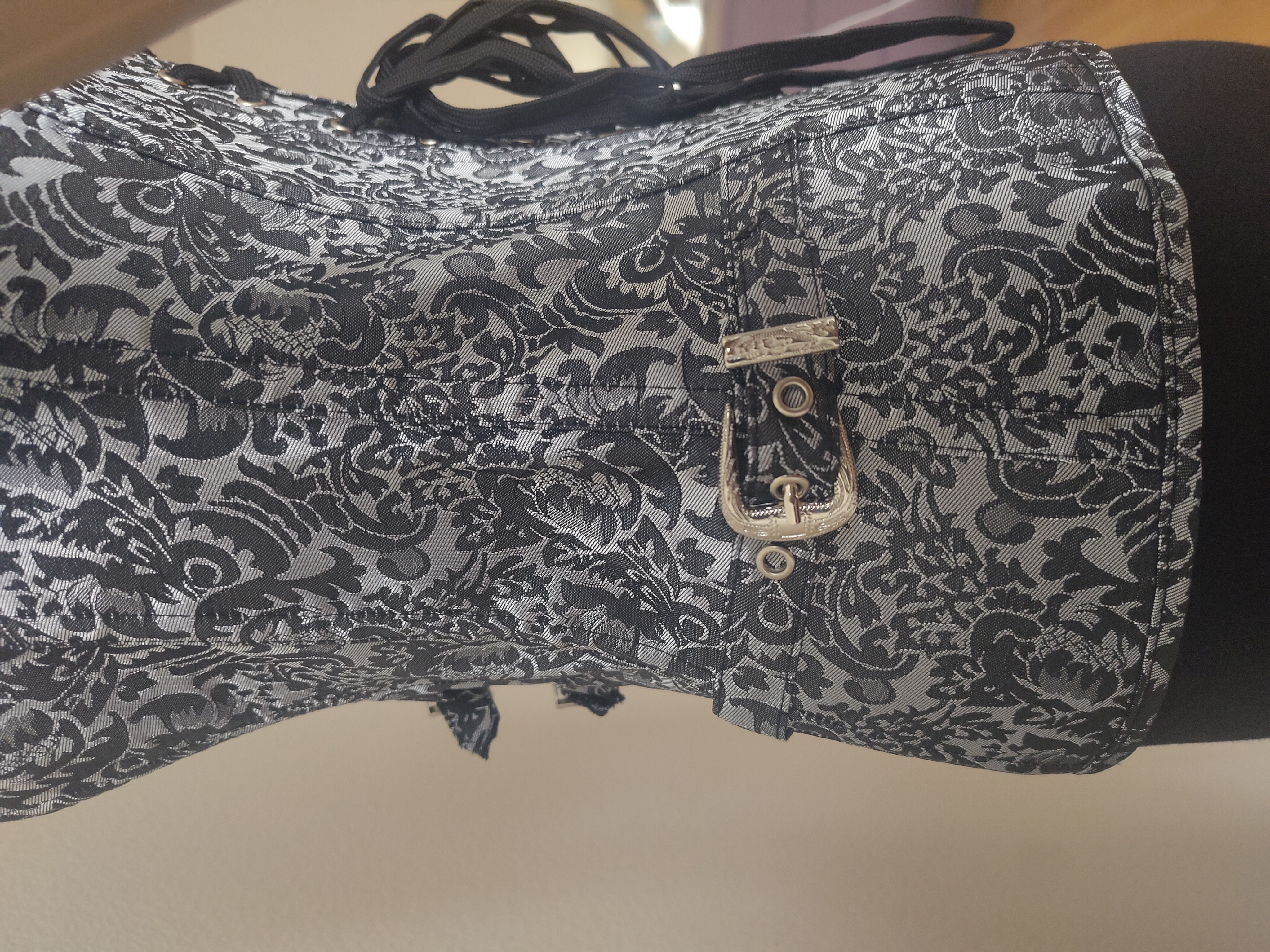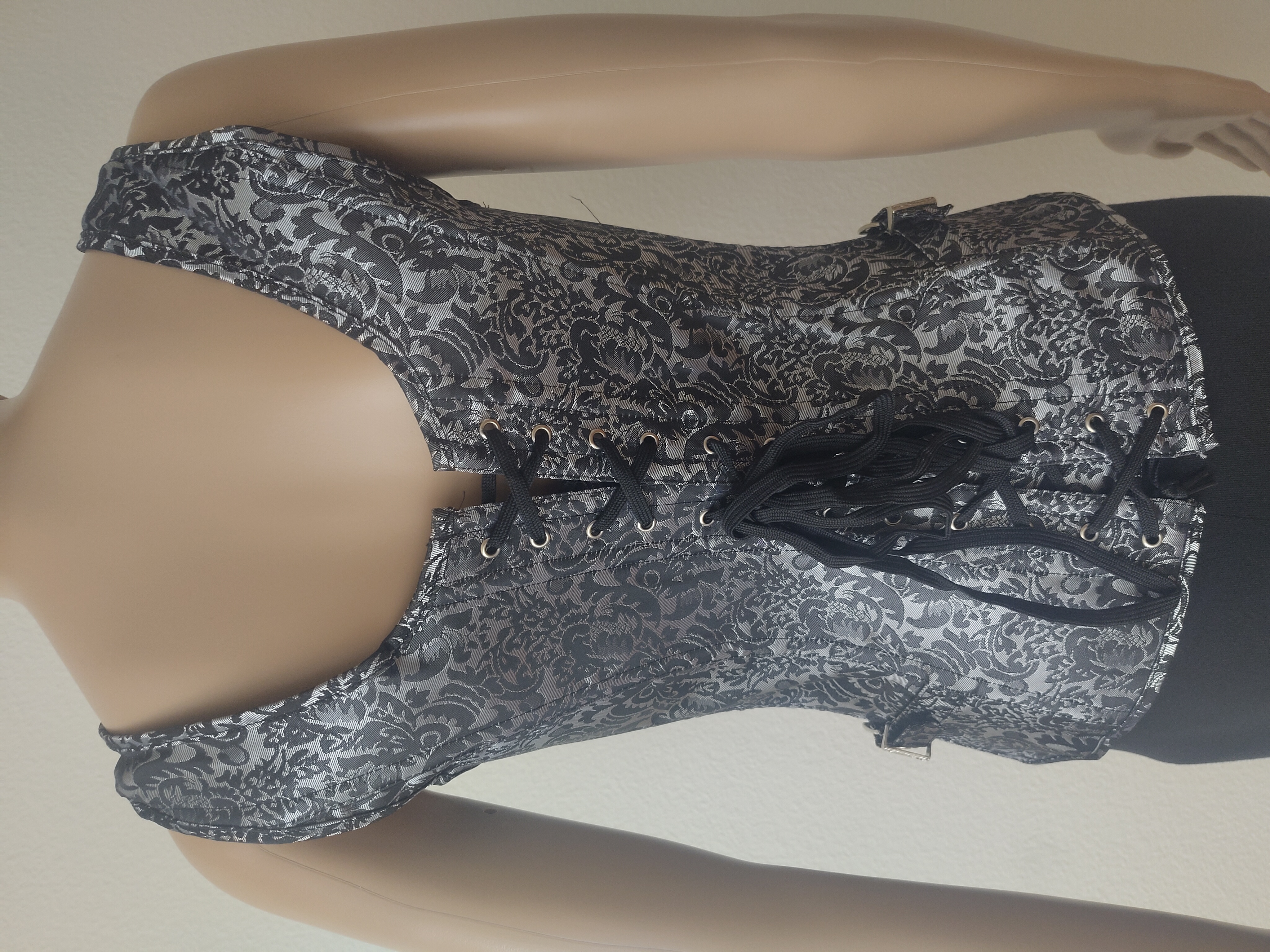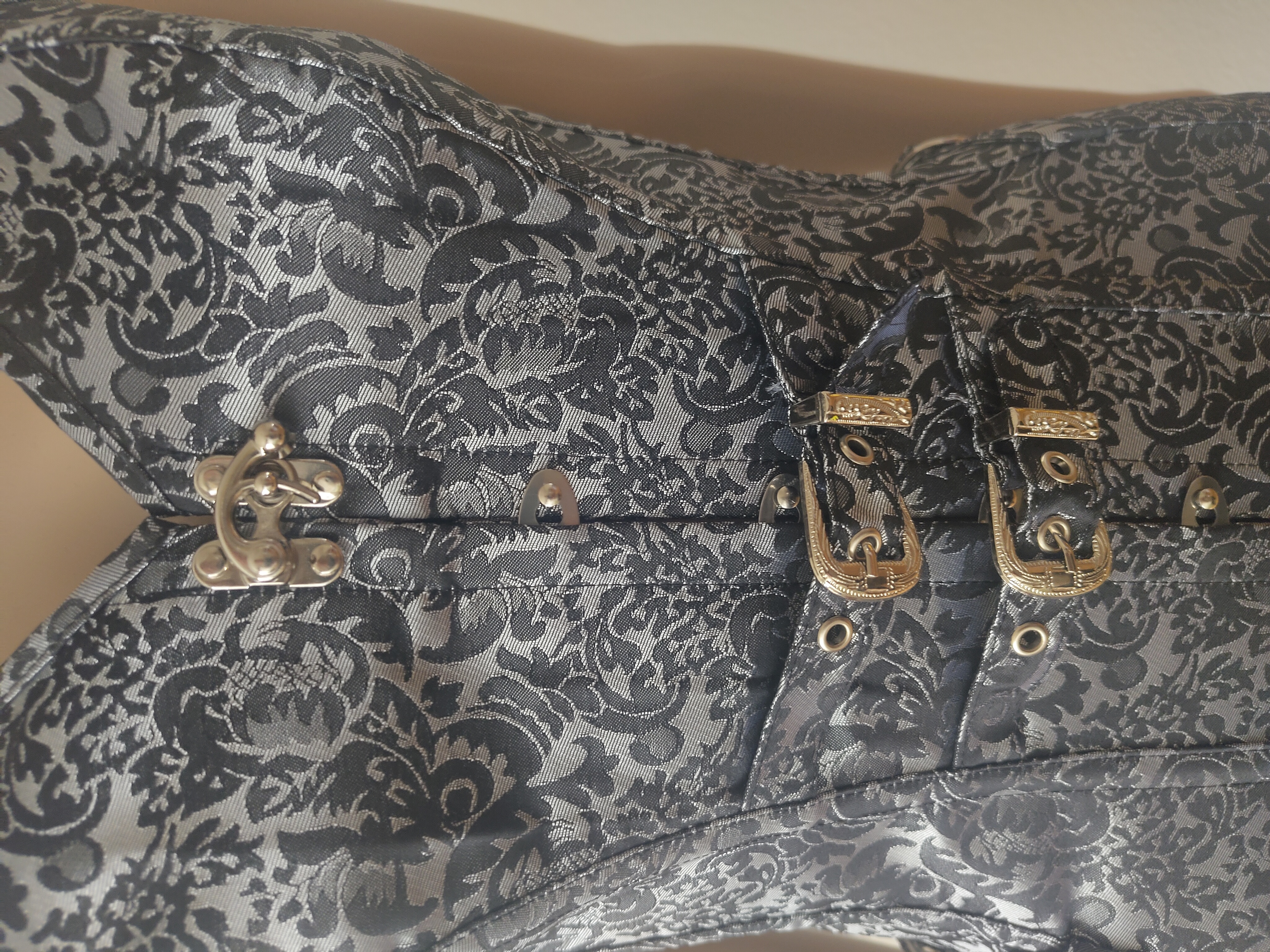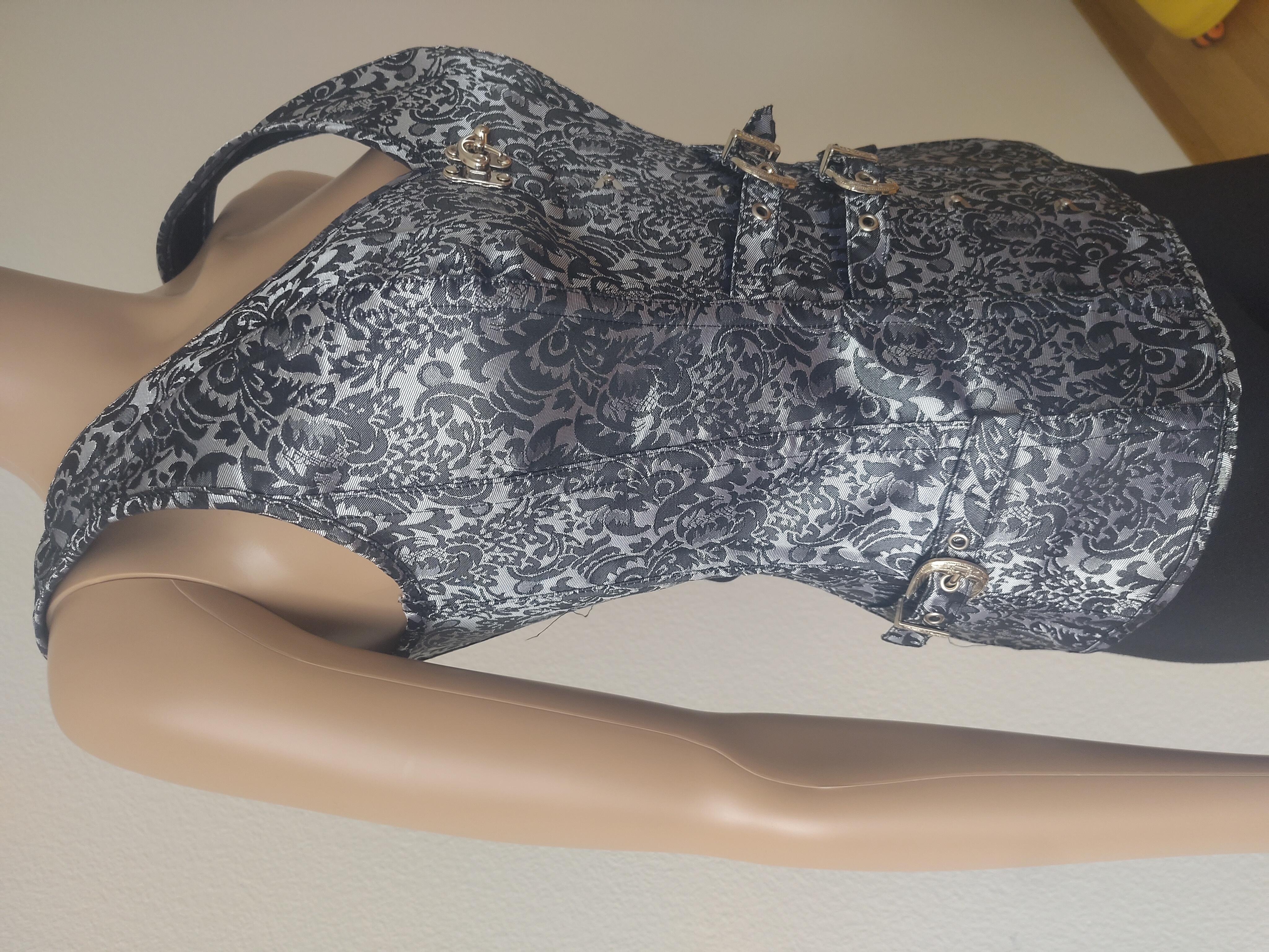Dieses silberfarbige Korsett vereint extravagantes Design mit klassischer Korsettkunst. Die dekorativen Schnallen an der Vorderseite und an den Seiten setzen markante Akzente und unterstreichen den modernen, leicht industriellen Look. Die Knopfleiste vorne ermöglicht ein einfaches An- und Ausziehen, während die Schnürung am Rücken eine individuelle Anpassung an die Figur erlaubt.