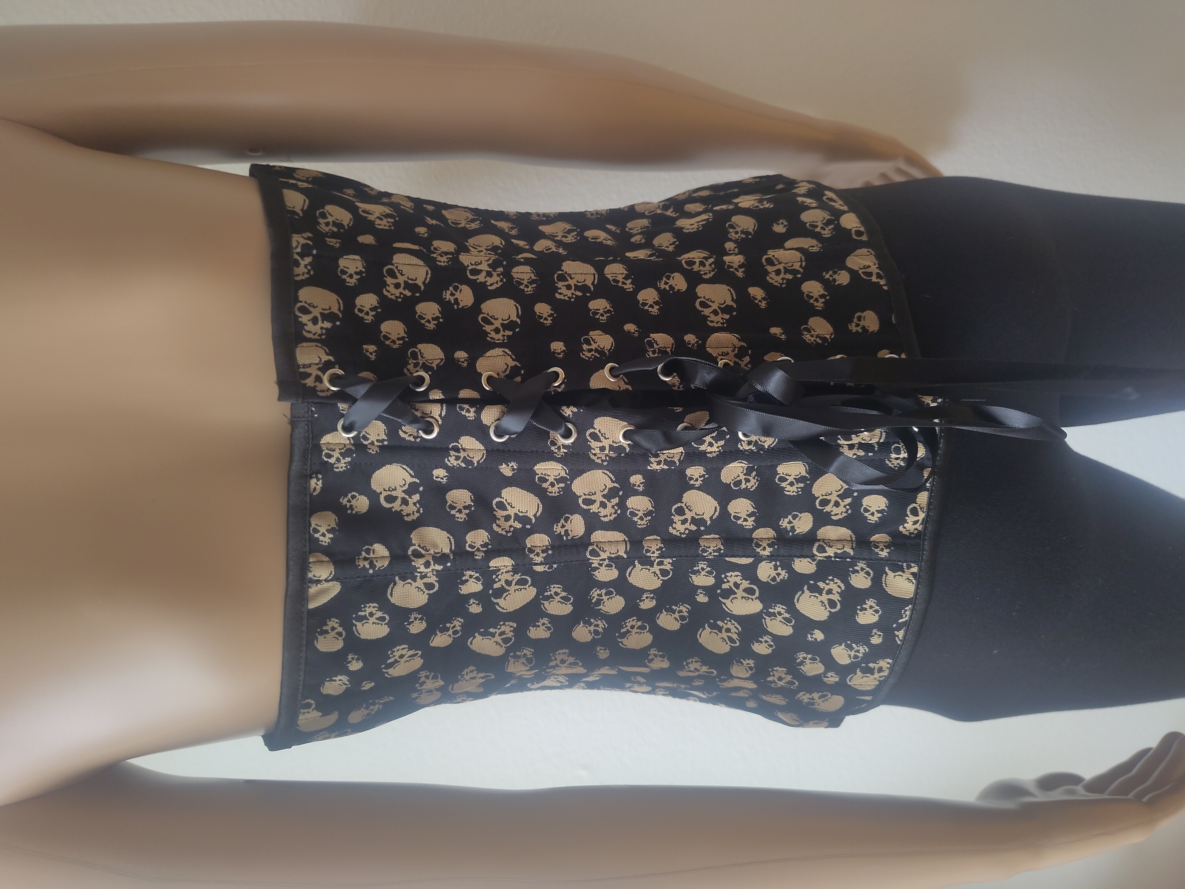 Dieses schlichte Overbust Korsett überzeugt durch seinen markanten Totenschädel-Print und eine klassische, figurformende Passform. Der dezente Druck verleiht dem Korsett eine moderne, leicht rebellische Note, ohne dabei aufdringlich zu wirken. Der Hakenverschluss an der Vorderseite sorgt für ein einfaches Anlegen, während die Schnürung am Rücken eine individuelle Anpassung an die Figur ermöglicht und die Taille elegant betont.