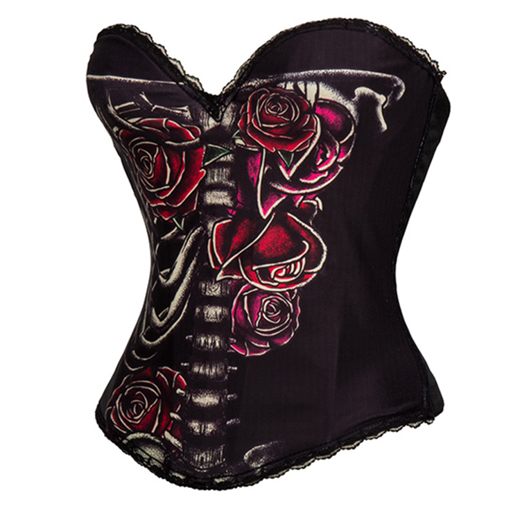 Gefertigt aus elastischer Baumwolle, schmiegt sich das Korsett angenehm an und bietet sowohl vorne als auch hinten hohen Tragekomfort. Das auffällige Sugar Skull Muster mit Skelett-Motiv und roten Rosen sorgt für eine düstere, aber zugleich feminine Ausstrahlung.