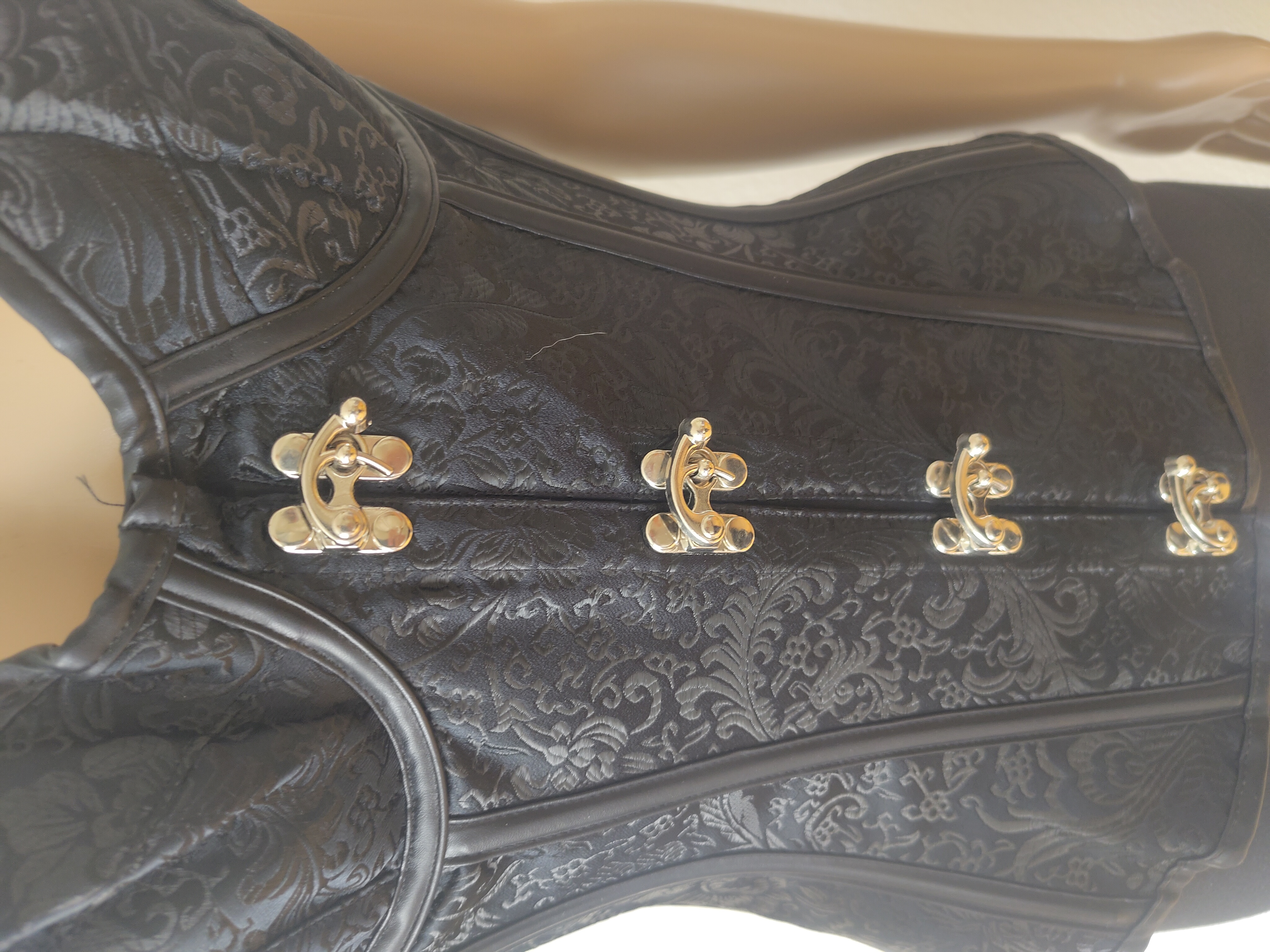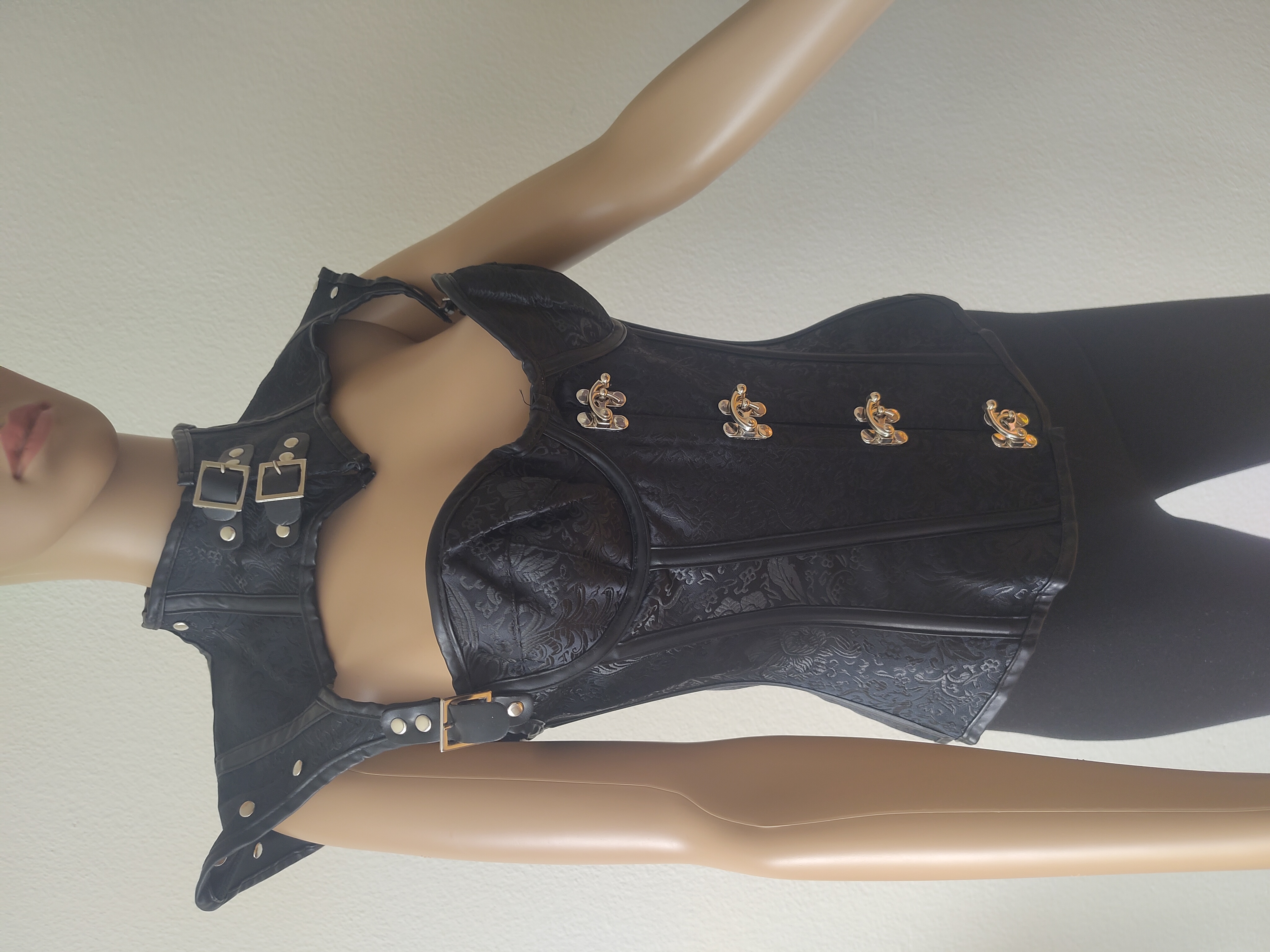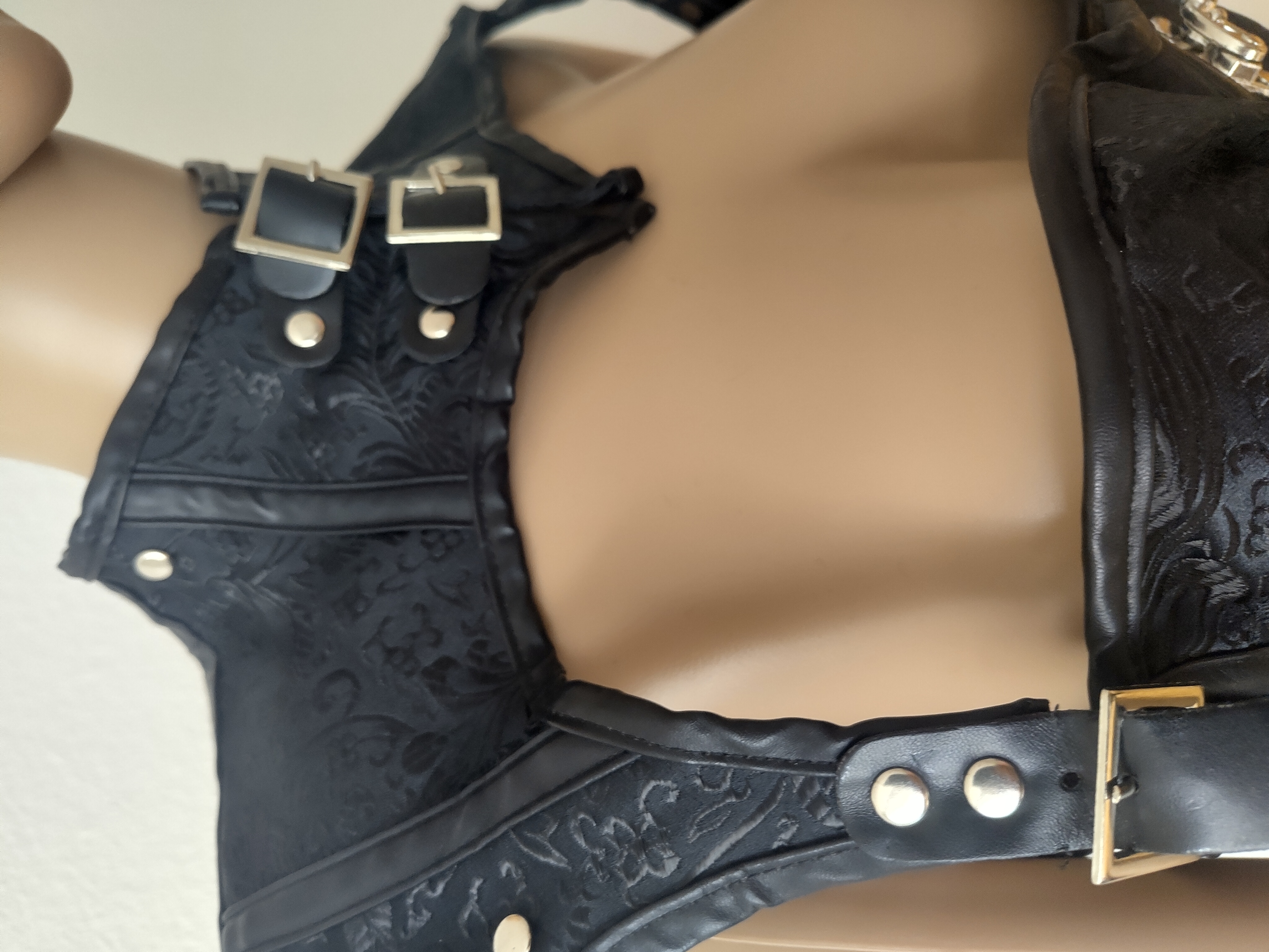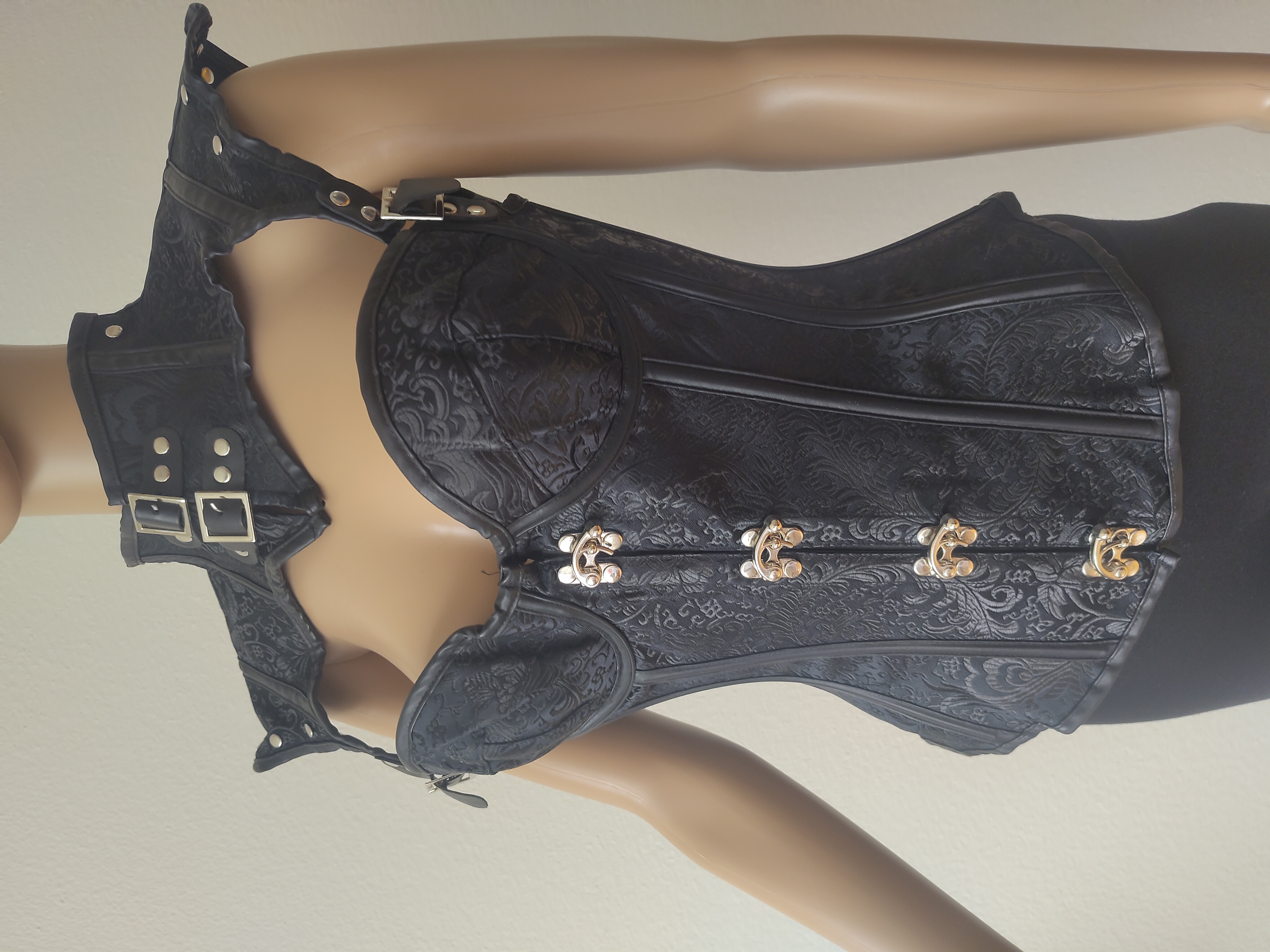 Das Korsett überzeugt durch sein markantes Design: Nietenverzierungen an Schultern und Rücken verleihen ihm eine kraftvolle Optik, während die vier Hakenverschlüsse vorne für Stabilität und authentischen Steampunk-Charme sorgen. Schnallen an Schulter und Hals setzen auffällige Akzente und ermöglichen eine individuelle Passform.