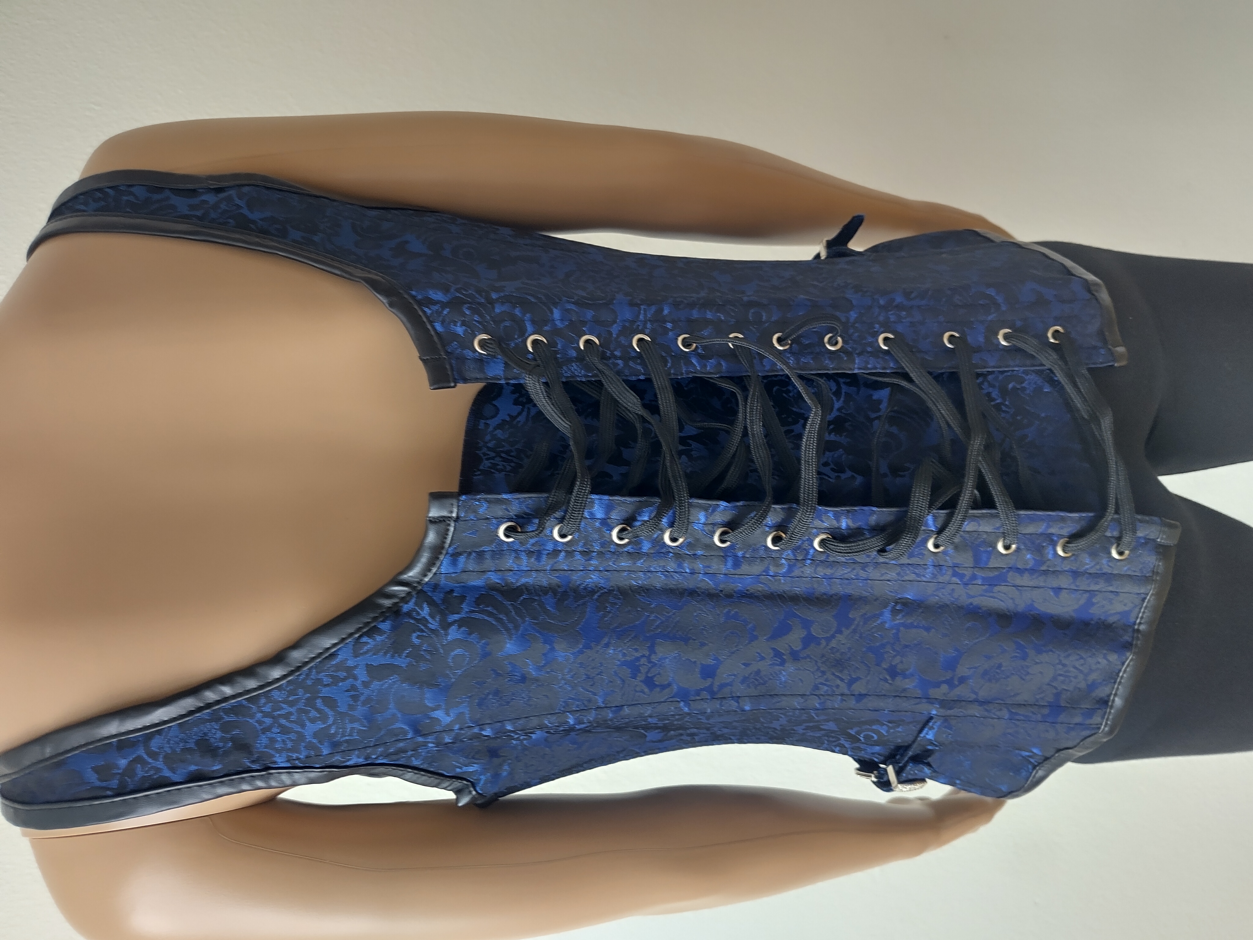 Dieses dunkelblaue Korsett überzeugt durch sein markantes Design und hochwertige Details. Verstellbare Schnallen an den Schultern, an den Seiten und auf der Vorderseite ermöglichen eine individuelle Anpassung und setzen zugleich stilvolle Akzente. Der Hakenverschluss sowie die Verschlussleiste vorne sorgen für einen sicheren Halt und ein bequemes An- und Ausziehen.