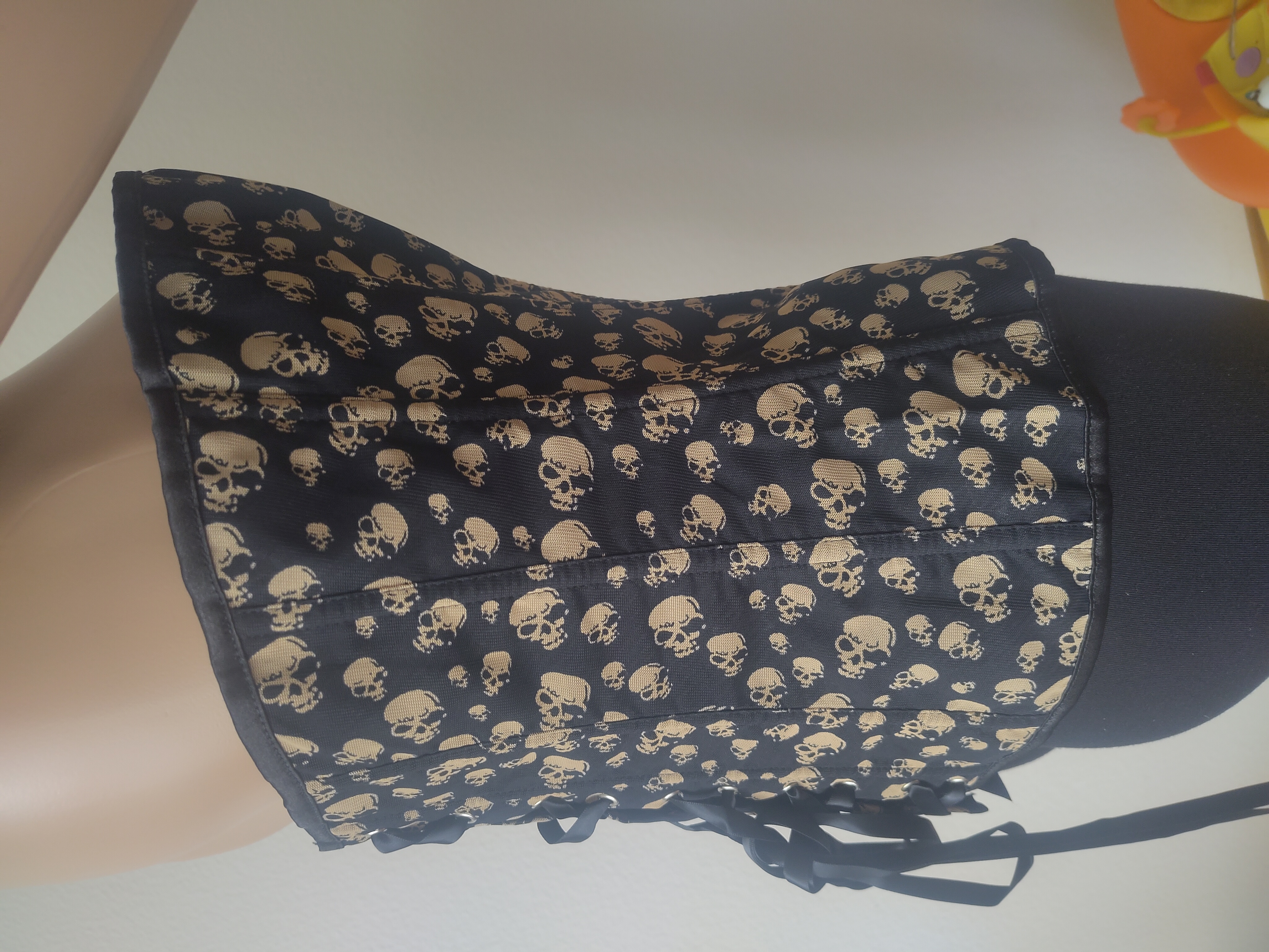 Dieses schlichte Overbust Korsett überzeugt durch seinen markanten Totenschädel-Print und eine klassische, figurformende Passform. Der dezente Druck verleiht dem Korsett eine moderne, leicht rebellische Note, ohne dabei aufdringlich zu wirken. Der Hakenverschluss an der Vorderseite sorgt für ein einfaches Anlegen, während die Schnürung am Rücken eine individuelle Anpassung an die Figur ermöglicht und die Taille elegant betont.